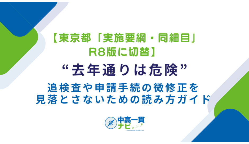 東京都は例年、都立中等教育学校・都立中学校等の入学者決定に関する「実施要綱」「同細目」を年度版で公開し、R8版への切替を順次告知しています。加えて、R7→R8の主な変更点をまとめた別紙PDF(名称は年度により表記揺れあり)が掲載され、現場が差分を把握しやすい構成です。改定は大枠よりも注記・脚注・別紙に集まる傾向があり、追検査(感染症・荒天・交通障害など)の実施可否や申請期限、出願サイトの運用注記、特別な配慮(別室・時間配分・ICT等)申請手順の記述整理が主戦場になりがちです。