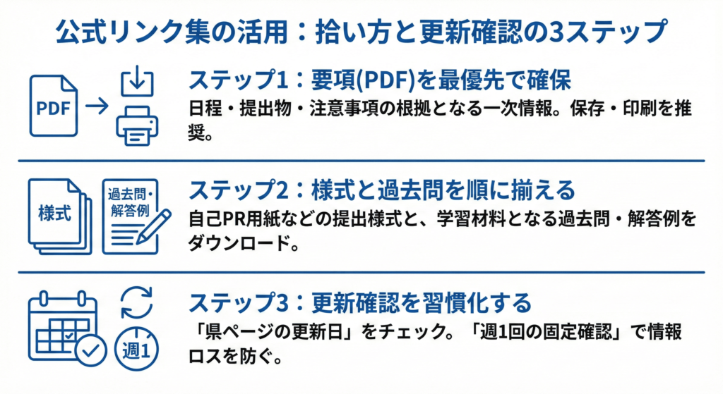 公式リンク集を使うときの基本は、順番を決めて“型”にすることです。おすすめは、(1)要項→(2)様式→(3)過去問 の3段。まず要項(PDF)が最優先で、日程・提出物・注意事項の根拠はここに集約されています。次に、必要に応じて自己PR用紙などの提出様式をダウンロード。最後に、過去問(適性検査問題)と解答例を取りに行く流れです。