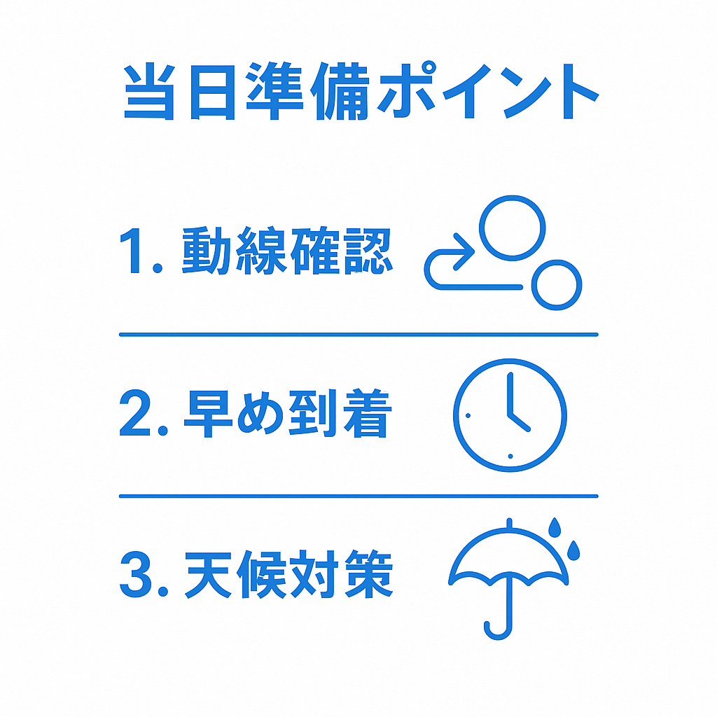 試験や説明会は、入場動線の把握が当日パフォーマンスを左右します。事前に地図上で門・受付・控室・掲示の位置をイメージし、想定ルートを一つに固定しておくと迷いが減ります。朝のラッシュ帯は、駅構内から地上出口までの混雑や、校門前の合流渋滞が発生しがち。“30~40分前到着”を目安に、余裕時間を必ず確保しましょう。雨天時は傘の持ち替え・一時置き場、気温差の調整(上着・飲料)まで用意すると安心です。