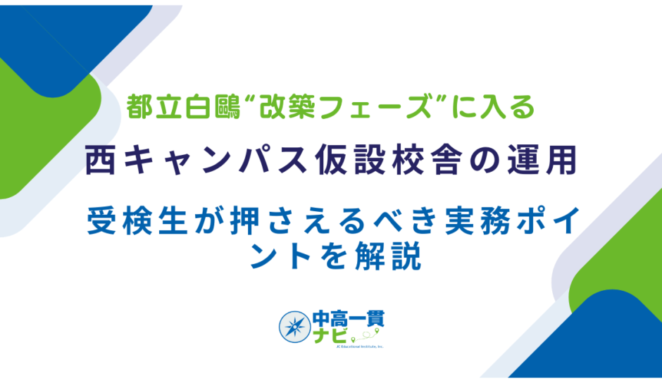 上野・浅草に立地する都立白鷗が、いま改築に伴う仮設運用の真っ只中にあります。学校のパンフレットでは、東校舎の建て替えに合わせて西校舎の校庭に仮設校舎を設置し、令和6年夏から中1~高3の全学年が同一敷地で学ぶ体制に移行したことが明記されました。受検生と保護者にとっては、学習環境の変化だけでなく、説明会会場・通学動線・試験当日の導線など“実務”にも関わるニュースです。本稿は公式資料に基づき、事実をコンパクトに整理。続いて、受検直前期に確認したいポイントと、塾・予備校の現場で活かせる運用アイデアを提案します。