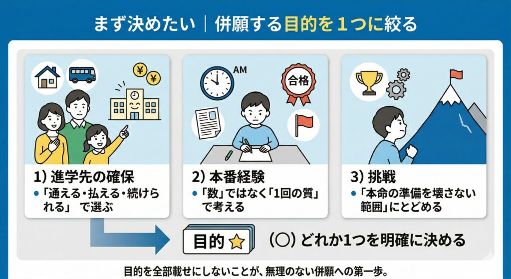 併願の目的は「進学先確保」「本番経験」「挑戦」のどれか1つに絞ると、受験数と学習負荷が暴れにくくなります。