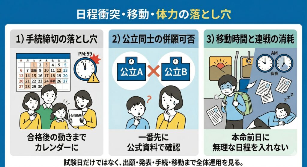 試験日が重ならなくても、手続が重なることは普通にあります。特に公立側は、合格後の意思確認や入学手続の期間が短いケースがあります。つまり、受ける前より、受かった後の動きで詰まりやすいということです。カレンダーには試験日だけでなく、出願開始日、書類必着日、発表日、手続締切日まで並べて書くのが基本です。