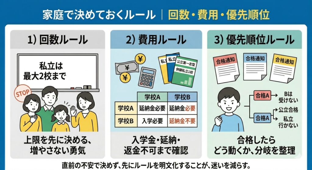 家庭で先に決めるべきは、受験回数の上限・費用の許容範囲・合格後の優先順位です。