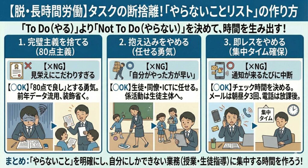 「To Doリスト(やることリスト)」を作っている先生は多いですが、仕事が減らない原因はそこにあります。先生の仕事は無限に増殖するため、意識的に「Not To Doリスト(やらないことリスト)」を作らない限り、時間は永遠に足りません。