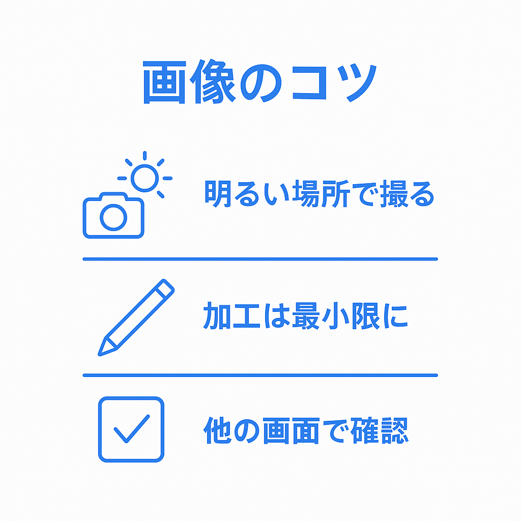 最頻出は、①容量オーバー/小さすぎ(スマホ“高効率”やSNS保存で劣化)、②横向き/傾き(カメラの自動回転情報に依存)、③影・背景のムラ(自宅撮影の照明不足)、④髪・衣服で顔が隠れる、⑤期限超過の古い写真、⑥フィルタ加工の痕跡。これらは撮影→確認→加工→書き出しの各段で対処できます。撮影は自然光+壁面背景で、肩まで入る距離をキープ。加工はトリミングと容量調整のみに留め、解像度や縦横比を募集要項に合わせて書き出します。最後に別端末での見え方確認(スマホ/PC)と、ファイル名のルール(受検番号・氏名など指示があれば従う)を忘れずに。
